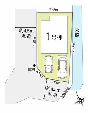 | 用途地域 | 1種低層 | 接道状況 | 南西4.5m 私道 北西4.5m 私道 |